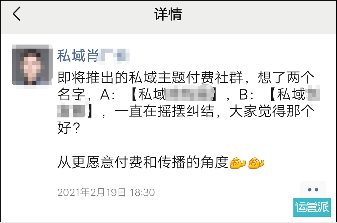正式发售前期,在朋友圈做互动,让用户提前了解到【私域XXX】产品。通过投票互动的低门槛方式,和用户共创产品名称,让用户参与其中,为正式发售汇聚人气。